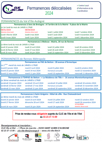 Dans un souci de proximité, le CLIC a mis en place des permanences délocalisées à Betton, Saint Grégoire, Sens-de-Bretagne et Melesse qui ont lieu une fois par mois, sur rendez-vous auprès du...